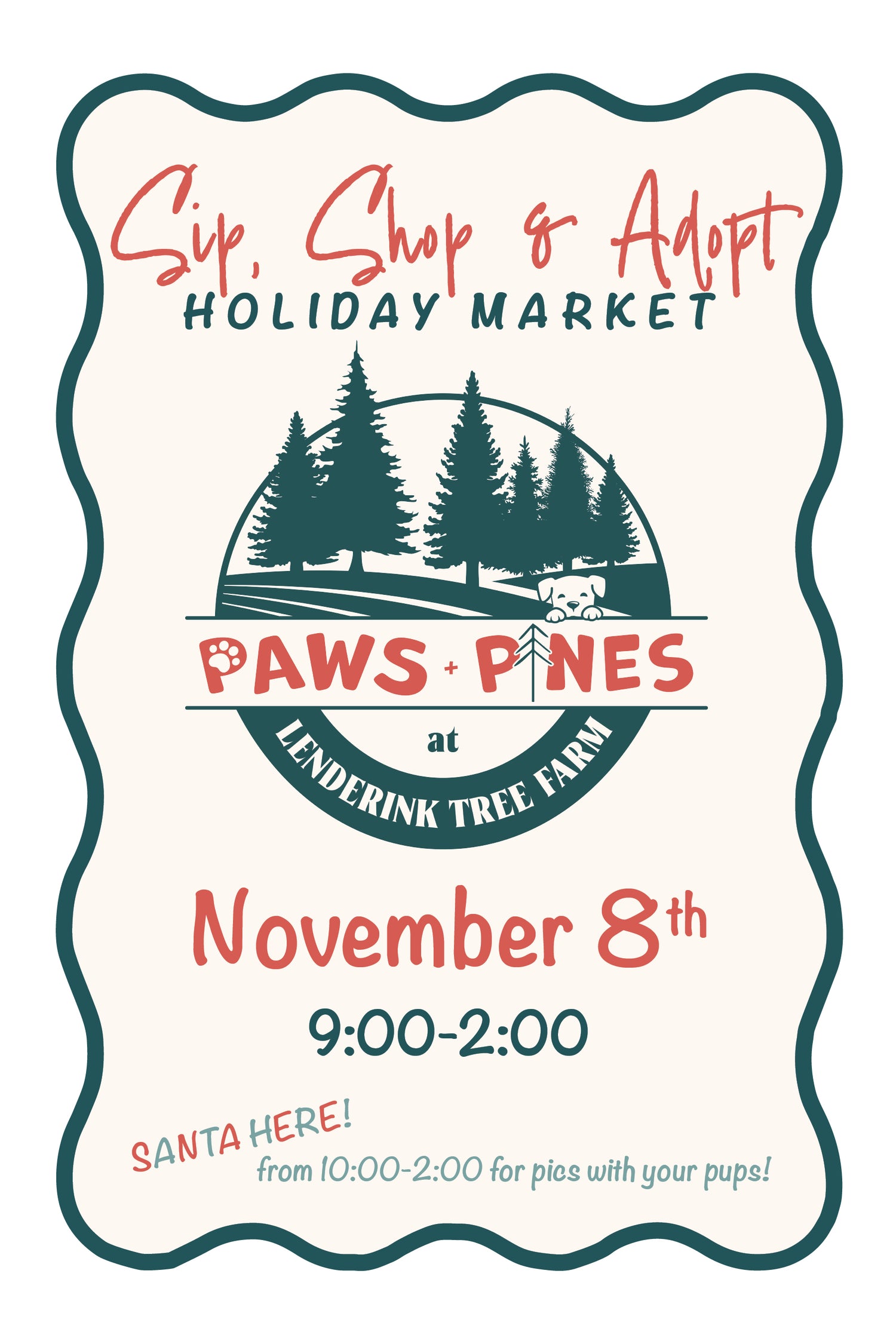 PAWS & PINES HOLIDAY MARKET • Sip, Shop & Adopt! November 8th 9am-2pm. Santa will be here from 10-2 for pics with your pups!